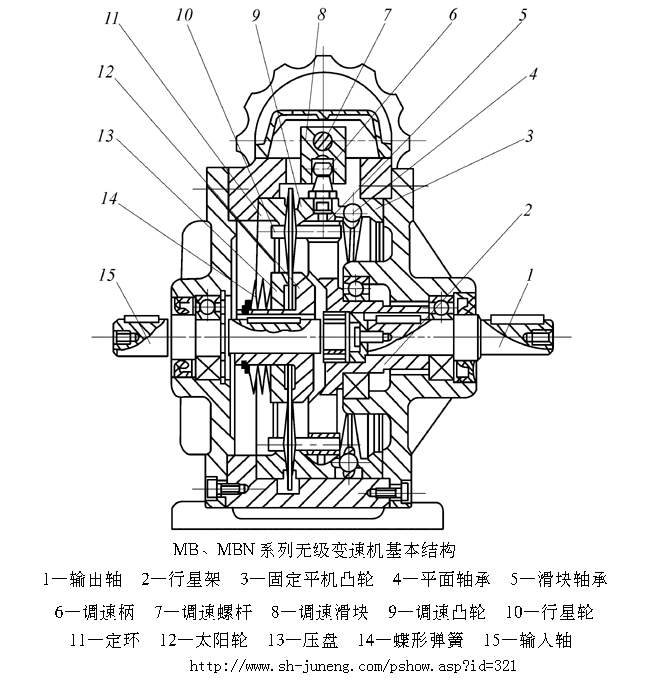 帶錐度的太陽輪12和壓盤13被一組碟形彈簧14壓緊,輸入軸15與太陽輪n鍵聯(lián)接,組成壓緊的輸入裝置。一組帶錐度的行星輪10內(nèi)側(cè)夾在壓緊的太陽輪與壓盤之間,外側(cè)夾在帶錐度的定環(huán)11和調(diào)速凸輪9之間,當輸入裝置轉(zhuǎn)動時,由于定環(huán)和調(diào)速凸輪固定不動,行星輪就沿定環(huán)作純滾動,且繞輸入軸作公轉(zhuǎn),通過行星輪軸及滑塊軸承5而帶動行星架2及輸出軸1轉(zhuǎn)l。